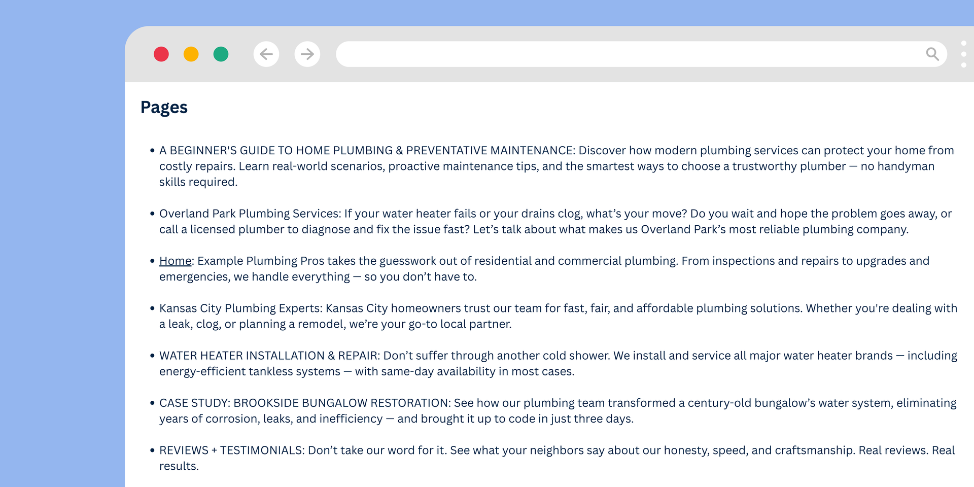 Instead of surfacing a list of links, AI synthesizes information across the web, pulling pieces from web pages to generate a natural language response. That means your content needs to be clear, trustworthy, and easy for LLMs to understand. AI might skip you altogether if your website content is vague, buried in poor structure, or outdated. Even worse, quote a competitor who explained your products and services better.