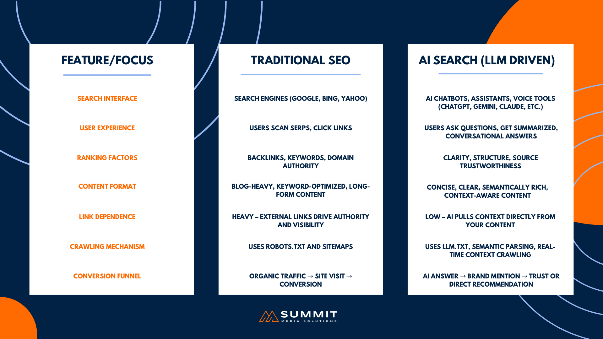 Think of it this way: Traditional SEO is like leaving breadcrumbs on a trail — the search engine follows the path and decides where it leads. AI search is like a detective walking into your website and immediately scanning the room for clues, tone, and relevance.